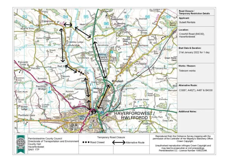 | Location:- | Crowhill Road (B4330), Haverfordwest – from its junction within the vicinity of the property known as Hunters Lodge, north west to its junction within the vicinity of the property known as Barnsley Farm |