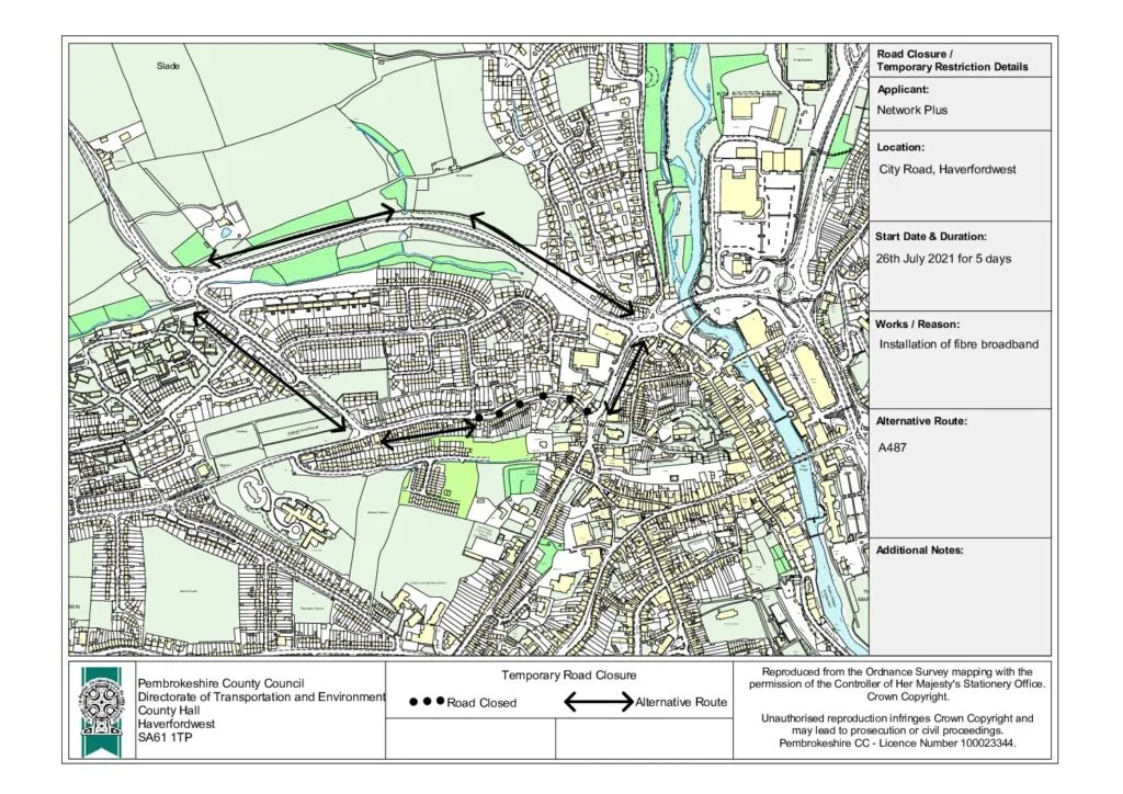 Mae Cyngor Sir Penfro wedi cyhoeddi Gwaharddiad Dros Dro ar Draffig Cerbydau (Cau Ffordd)