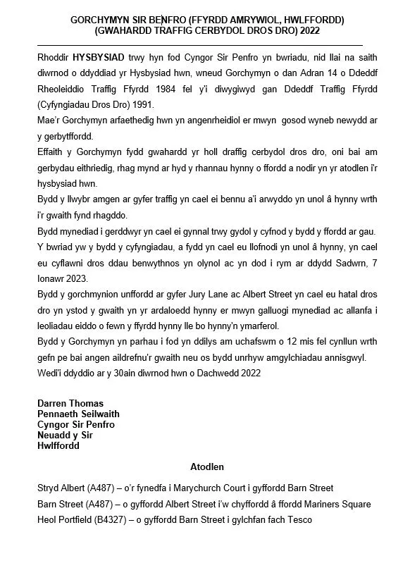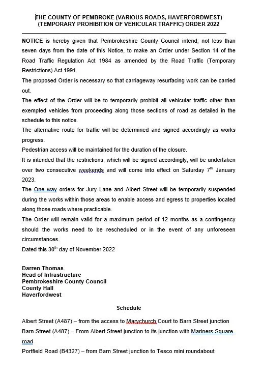 Temporary Road Closures – Barn Street/Albert Street/Portfield, Haverfordwest